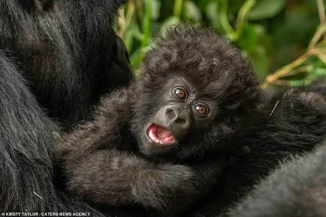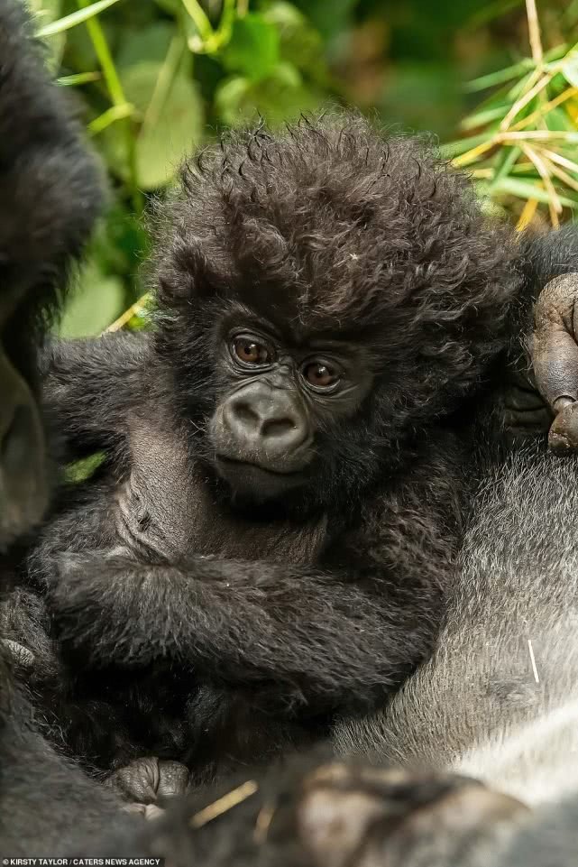 山地大猩猩媽媽會照顧小孩3到4年,直到小孩能夠獨自生活。Kirsty不僅拍到了大猩猩母子溫馨的瞬間,還拍到了這隻擁有自然捲的大猩猩寶寶,真是太幸運啦~