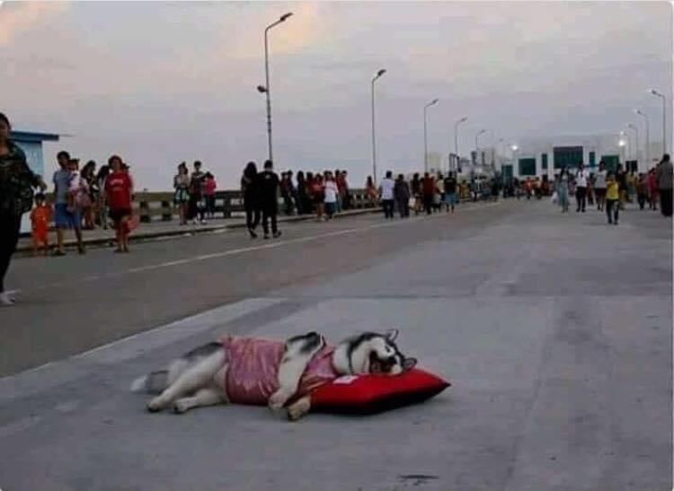 ▼馬路就是牠的床,還枕著枕頭,睡得很舒服嘛。