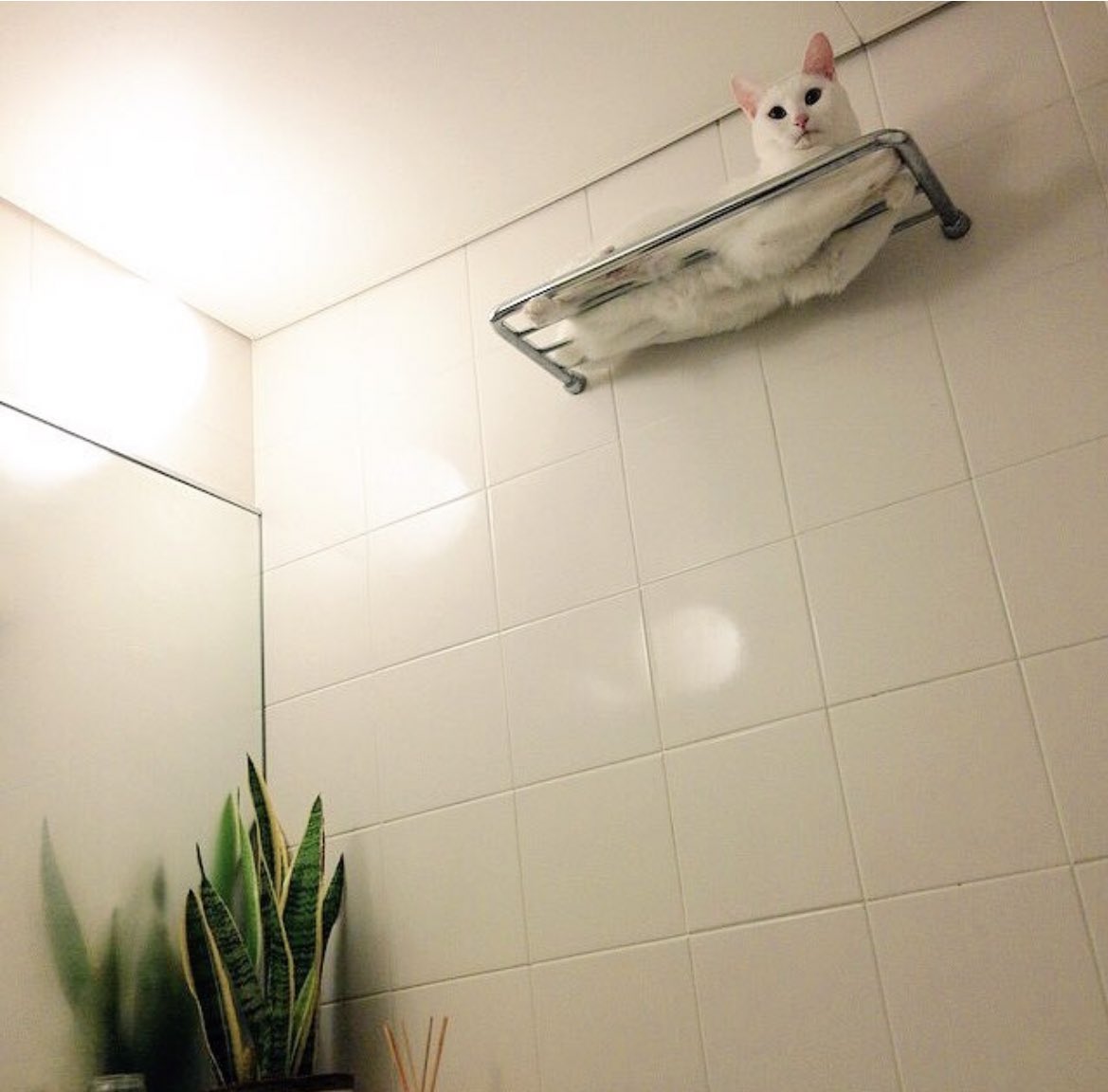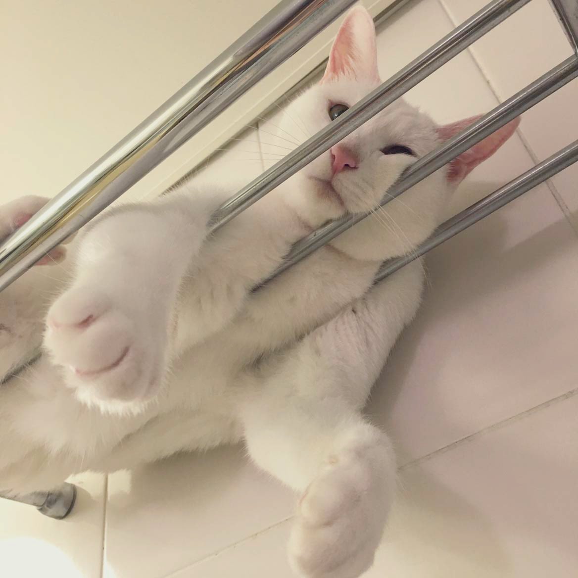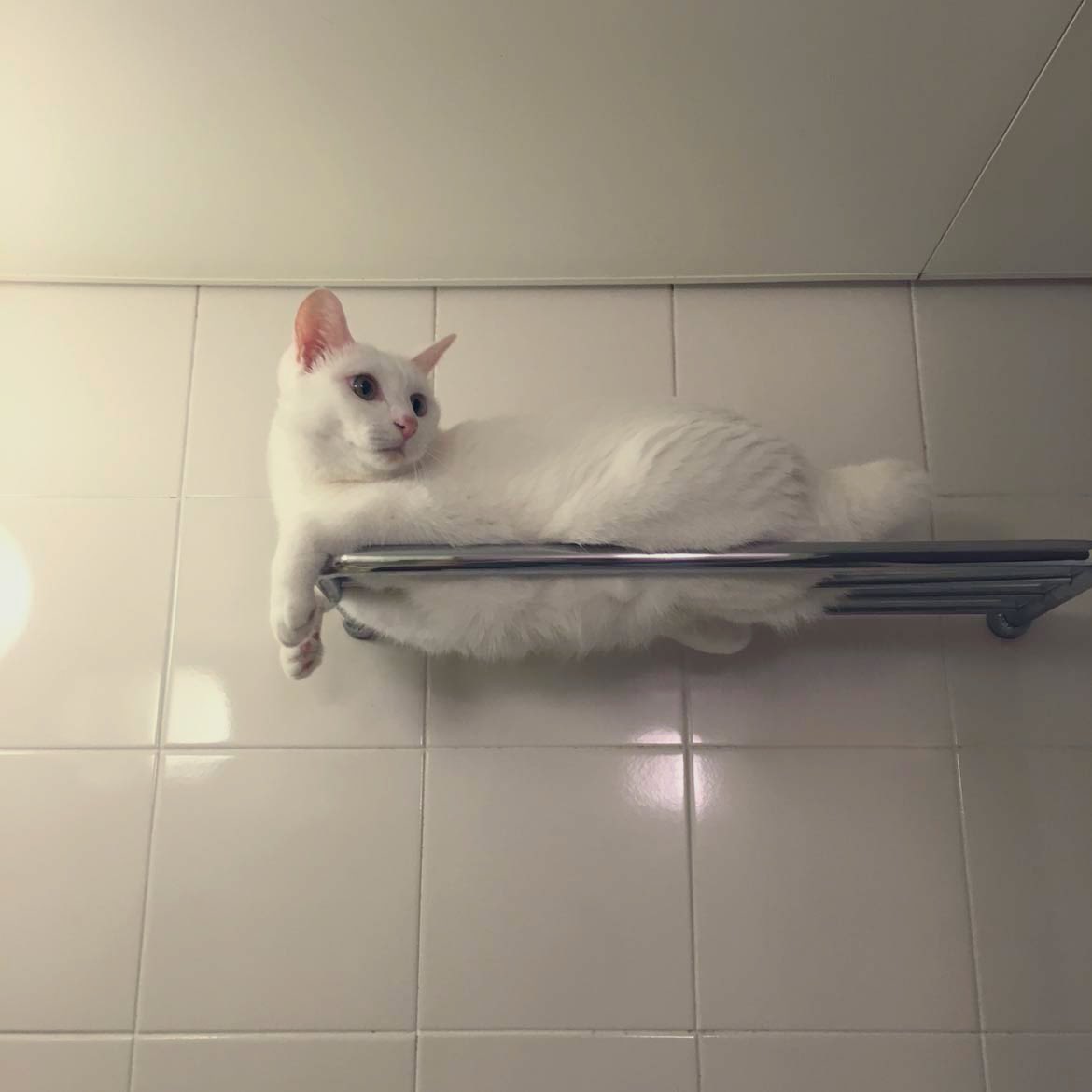 ▼這隻貓咪很喜歡趴在毛巾置物架上,偽裝成白色毛巾陪主人洗澡。牠躺在上面的時候一點也不違和,這毛巾一定很好用吧?
