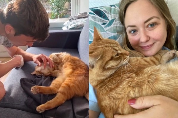 ▼這隻橘貓非常友善,也很愛撒嬌,Morgan和男友都非常喜歡牠。他們猜測這應該是有人飼養的貓咪,但從那一天開始,橘貓天天都來敲門,有時候一天能來好幾次。