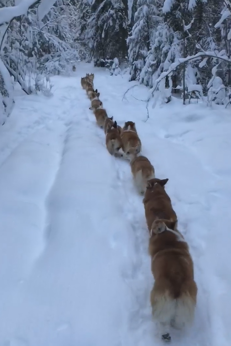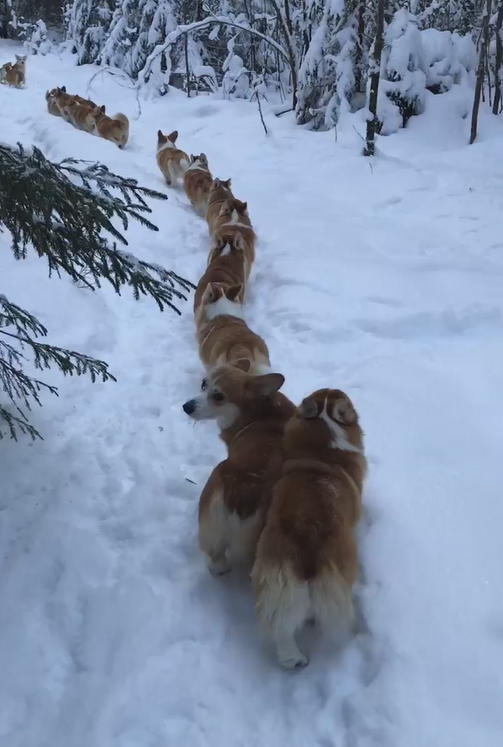 ▼之前國外一名網友@Октябрина Рондик在臉書上分享了一段雪地裡的柯基影片,從影片中可以看到,在皚皚白雪上出現一長串柯基,在厚厚的雪地上整齊有序地前行,就像是一輛正在工作的「柯基鏟雪車」,畫面壯觀又可愛。