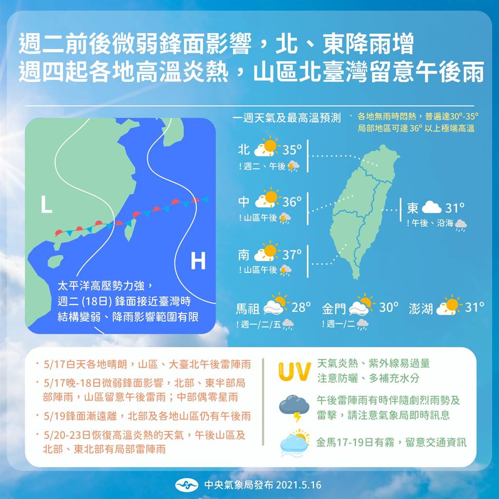 ▼降雨方面,今天僅馬祖有短暫陣雨或雷雨,午後大台北地區及各地山區亦有局部短暫雷陣雨。今晚起微弱鋒面接近,明天(18日)受到微弱鋒面影響,金門及馬祖有短暫陣雨或雷雨,中部以北及東半部地區有局部短暫陣雨或雷雨,東半部地區並有局部較大雨勢發生的機率,其他地區及澎湖為多雲,午後山區有局部短暫雷陣雨。