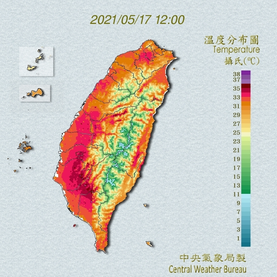 ▼氣象局表示,今天(17日)白天台灣各地及澎湖、金門大多為多雲到晴,高溫炎熱的天氣,西半部高溫可達34、35度,東半部約為31、32度,局部近山區、河谷及縱谷溫度會更高。大台北盆地、苗栗以南近山區內陸及花蓮縱谷高溫甚至超過36度,南高屏及南投可能出現38度以上高溫。
