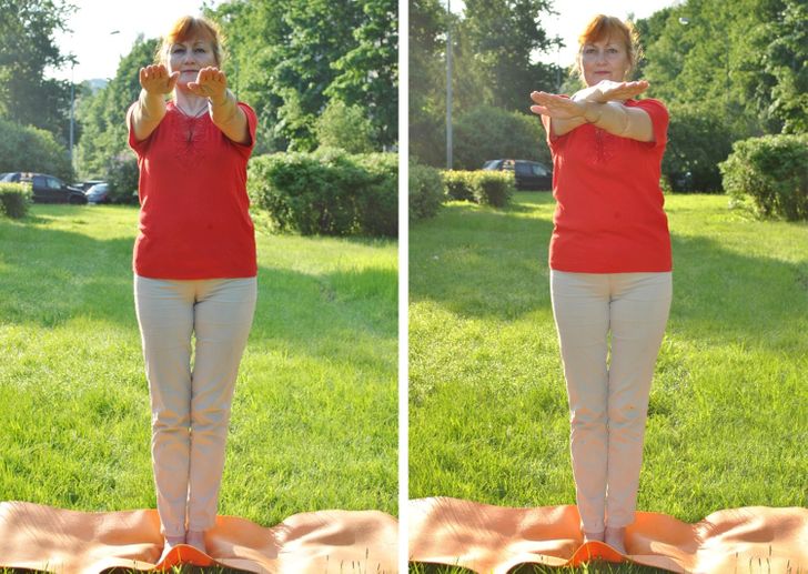 ▼7.剪刀手:身體挺直,雙臂前伸,雙臂小幅度地交叉,堅持30秒。