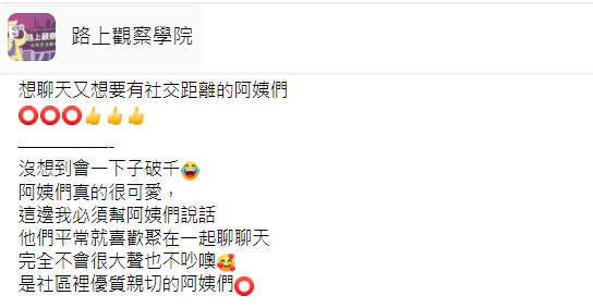 這則貼文很快吸引3萬多網友按讚,大家紛紛留言說:「她們就算保持距離講話的音量都一樣大聲」、「疫情當頭,八卦還是不能少」、「然後就噪音污染惹」、「其實可以用免洗杯接線」、「如果有四個紙杯,再拉四條線,就可以講悄悄話了」。也有網友表示:「蠻可愛的,還在5人以內」、「聊天模範生啊」、「很棒啊!我覺得這就是水準的表現」、「阿姨很棒,規範在四個以下」、「這才是真正值得鼓勵的台灣阿姨」。阿姨們都好棒~