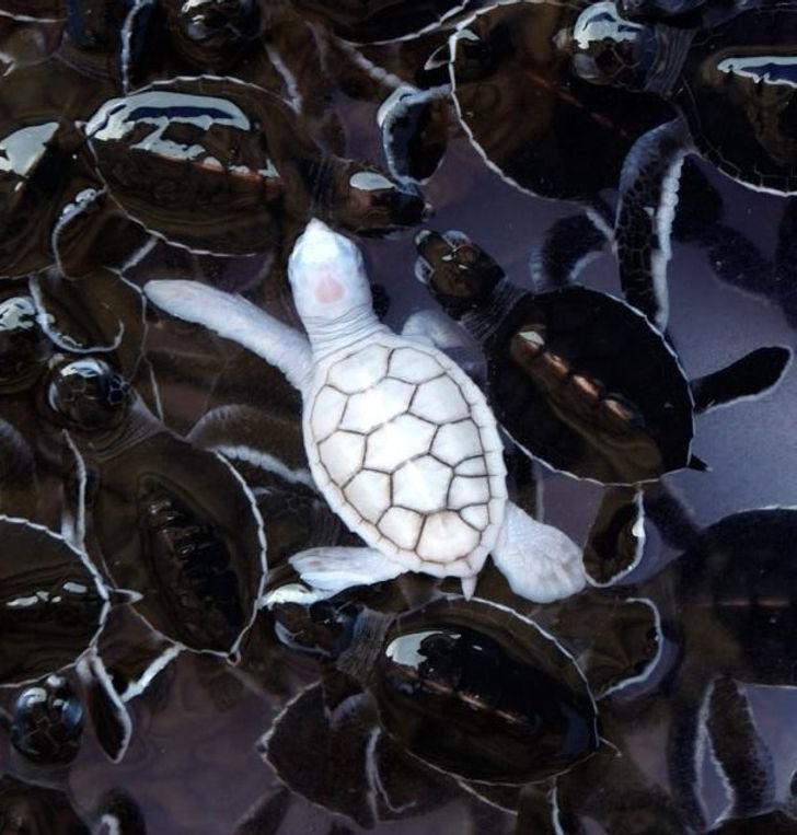 ▼在這麼多小烏龜裡,這隻白色的尤其特別。
