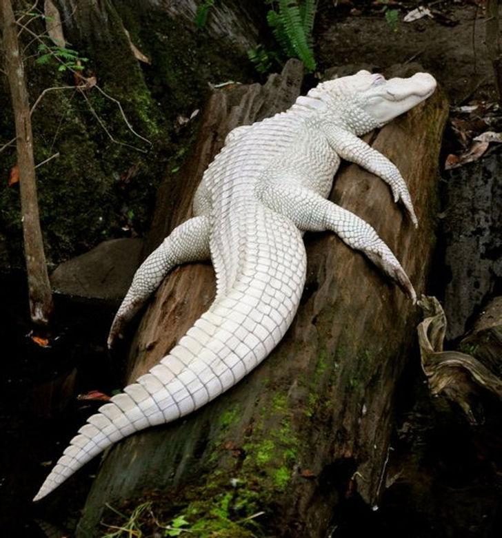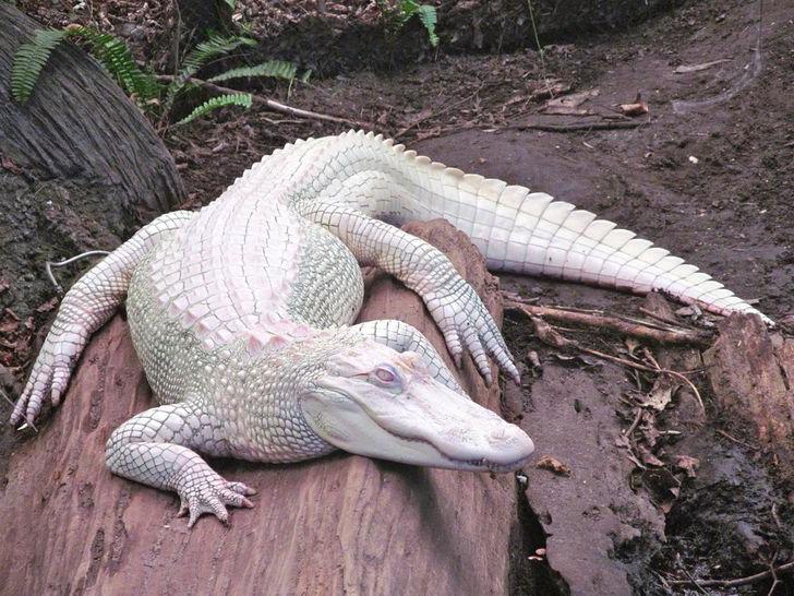 ▼曬日光浴的白化鱷魚。