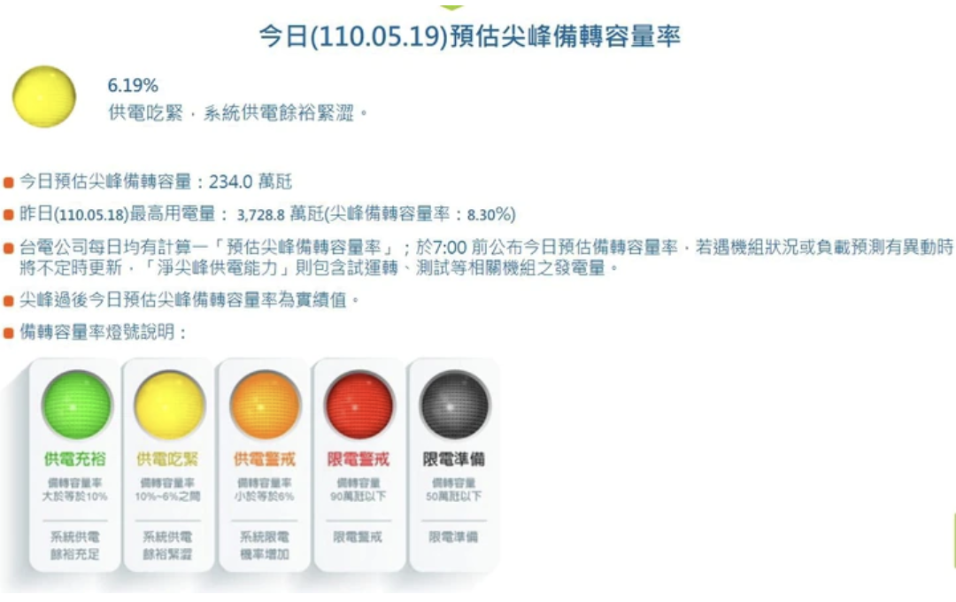2021年05月19日台電短短1週就出現2次無預警停電,引發民怨,民眾也很關心近來的用電情況。台電針對19日供電情況進行說明,表示氣象預報將出現38度高溫,再加上全台各級學校停課、民生用電增加,預計今天的日尖峰負載為3780萬瓩,比昨日的3728萬瓩增加52萬瓩。