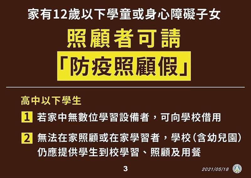 ▼教育部還表示,家長可比照相關規定申請防疫照顧假。5月19日至28日高中以下學校啟動線上學習期間,家長其中一人如有照顧12歲以下之學童,或國民中學、高級中等學校、五專一、二、三年級持有身心障礙證明子女之需求者,得申請防疫照顧假。