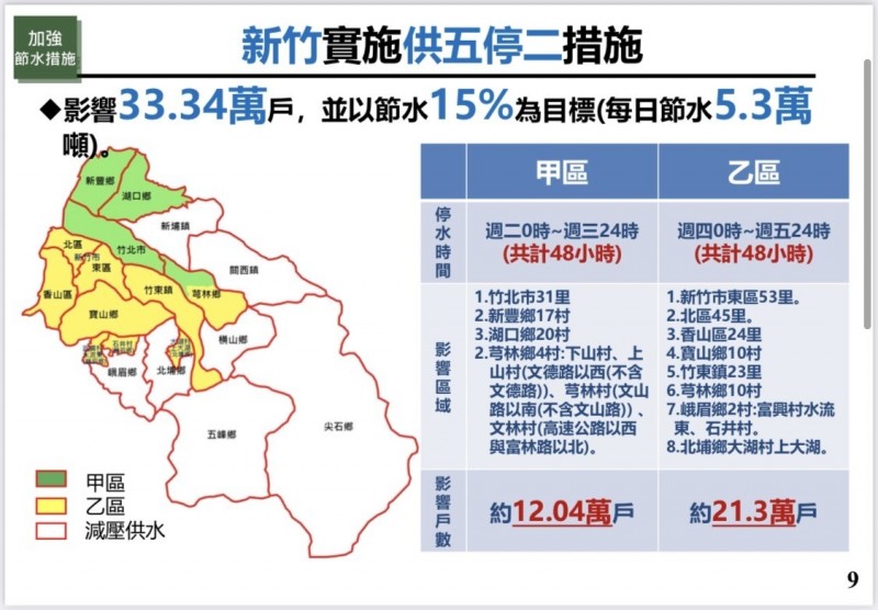 水利署表示,新竹實施「供五停二」將分為甲、乙兩區。甲區包含竹北市、新豐鄉、湖口鄉、芎林鄉、芎林村 、文林村等,合計影響約12.04萬戶,停水時間為週二0時至週三24時;乙區為新竹市東區、北區、香山區、寶山鄉、竹東鎮、芎林鄉、峨眉鄉、北埔鄉等,合計影響約21.3萬戶,停水時間為週四0時至週五24時。希望雨水快來吧~