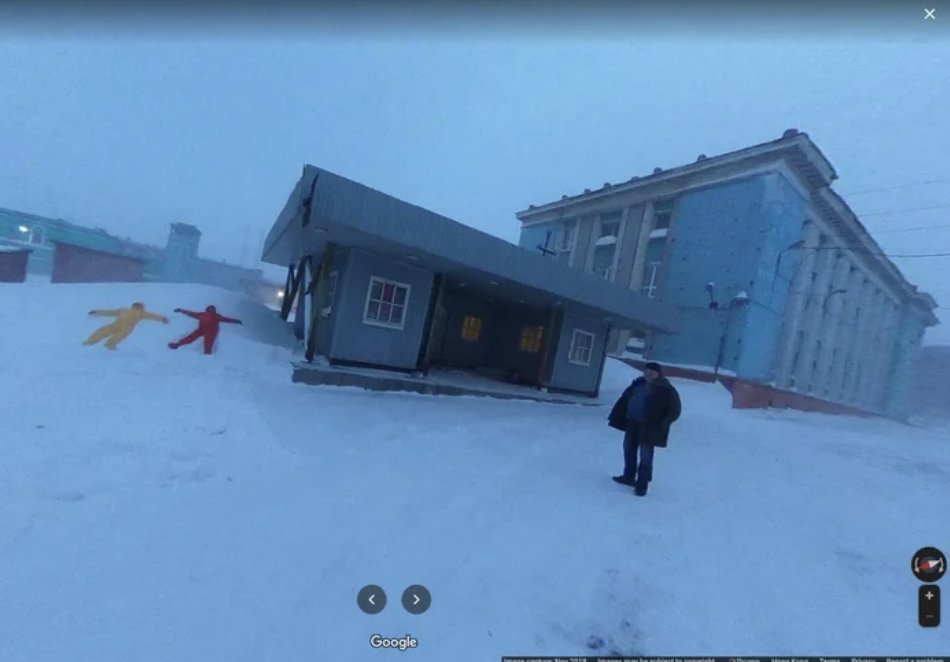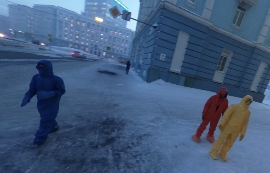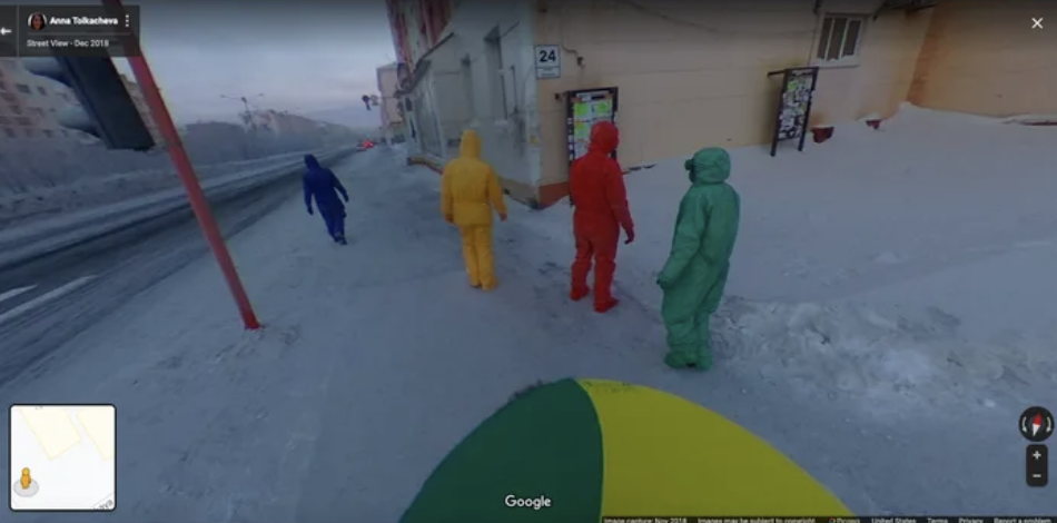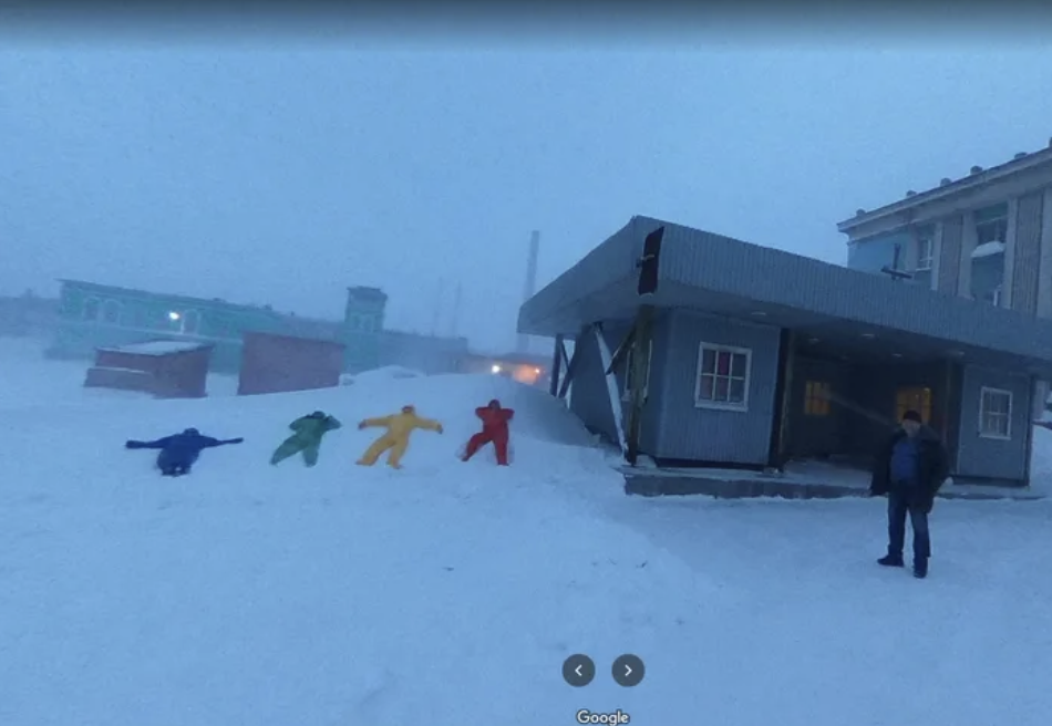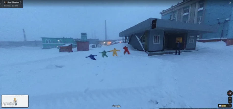 ▼這組照片是在俄羅斯克拉斯諾亞爾斯克邊疆區的諾里爾斯克(Norilsk)拍攝的。當地天氣寒冷,街道上有厚厚的冰雪,而且行人非常少。這4人分別穿著紫色、綠色、黃色和紅色的衣服,故意讓Google街景車拍到自己的身影,他們希望在Google街景中留下自己的蹤跡。
