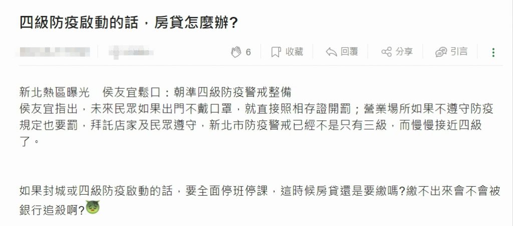 ▼原po表示,很多人的房貸佔收入的1/3,如果疫情嚴峻暫停上班,無法居家辦公的人的收入會大受影響。企業不支薪,每個月的房貸還要照常繳,沒有存款的話根本無法支撐這段時間的開銷。「四級防疫啟動的話,房貸怎麼辦?」