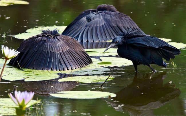 ▼黑鷺發現獵物後,會張開翅膀圍成一圈,變身成為一把傘。牠將頭縮在「傘」裡,等待獵物到「傘」下躲避。這把用翅膀圍成的「傘」就是黑鷺設置的陷阱,因為小型魚類喜歡躲在陰暗處休息、躲避天敵,等小魚游到翅膀的範圍內,黑鷺就能飽餐一頓。