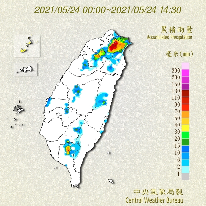 氣象局表示,今天(24日)白天鋒面接近,晚起至明天(25日)受鋒面影響,北部、東半部地區及金門有局部短暫陣雨或雷雨,東半部地區並有局部較大雨勢發生的機率,南部地區亦有零星短暫陣雨,其他地區及澎湖、馬祖為多雲,午後有局部短暫雷陣雨,各地山區並有局部較大雨勢發生的機率。