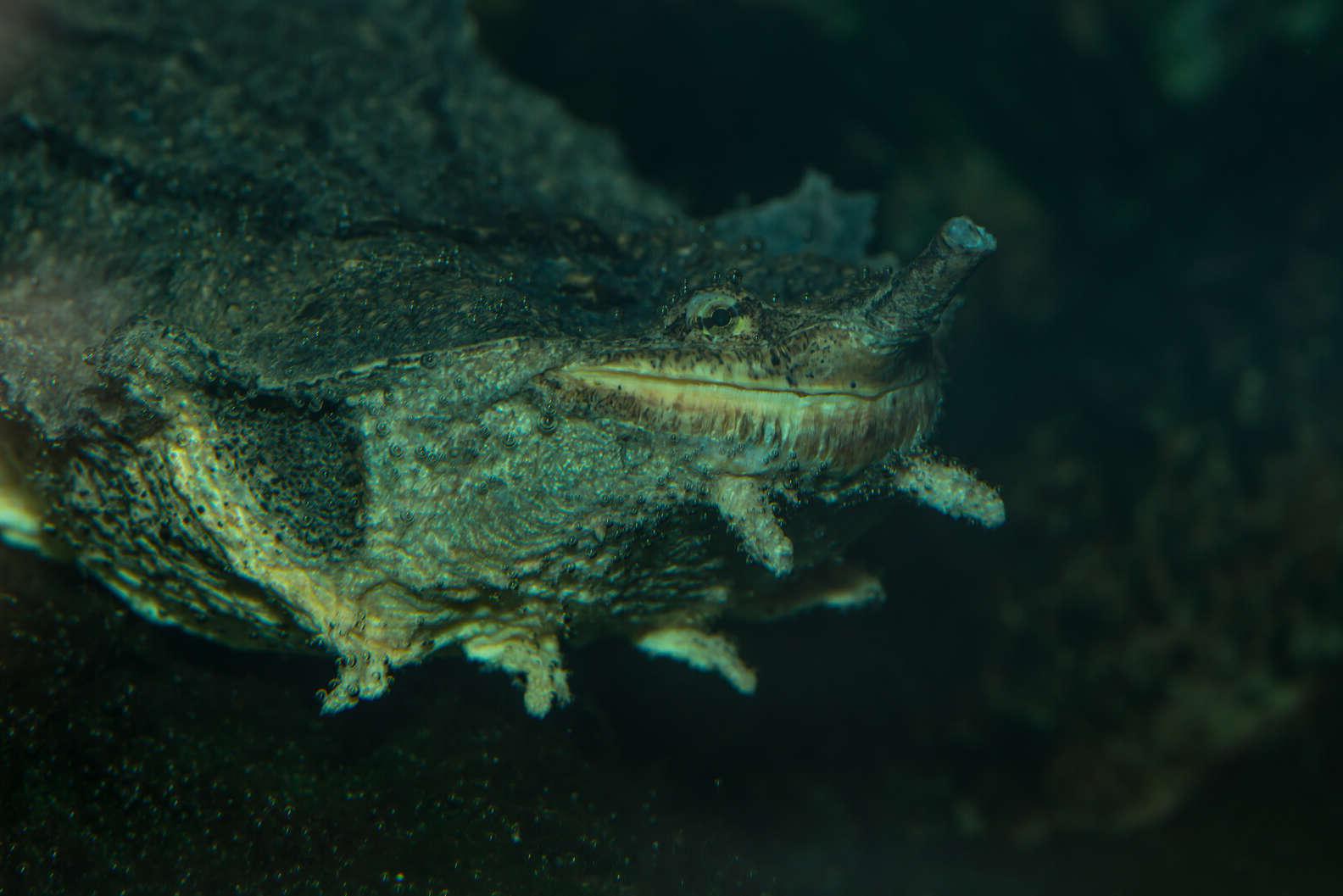 ▼楓葉龜通常會選擇一個地點趴下不動,等魚類游近時才張開嘴巴,形成低壓真空的環境,將獵物直接吸入嘴巴裡。這種直接吞噬的進食方式相當罕見。