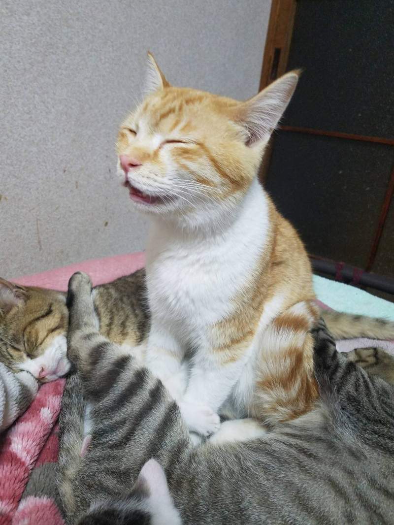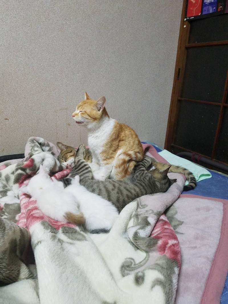橘貓不僅坐著睡覺,還要坐在貓咪堆裡,把同類們當成坐墊一定很舒服,也很有安全感吧?