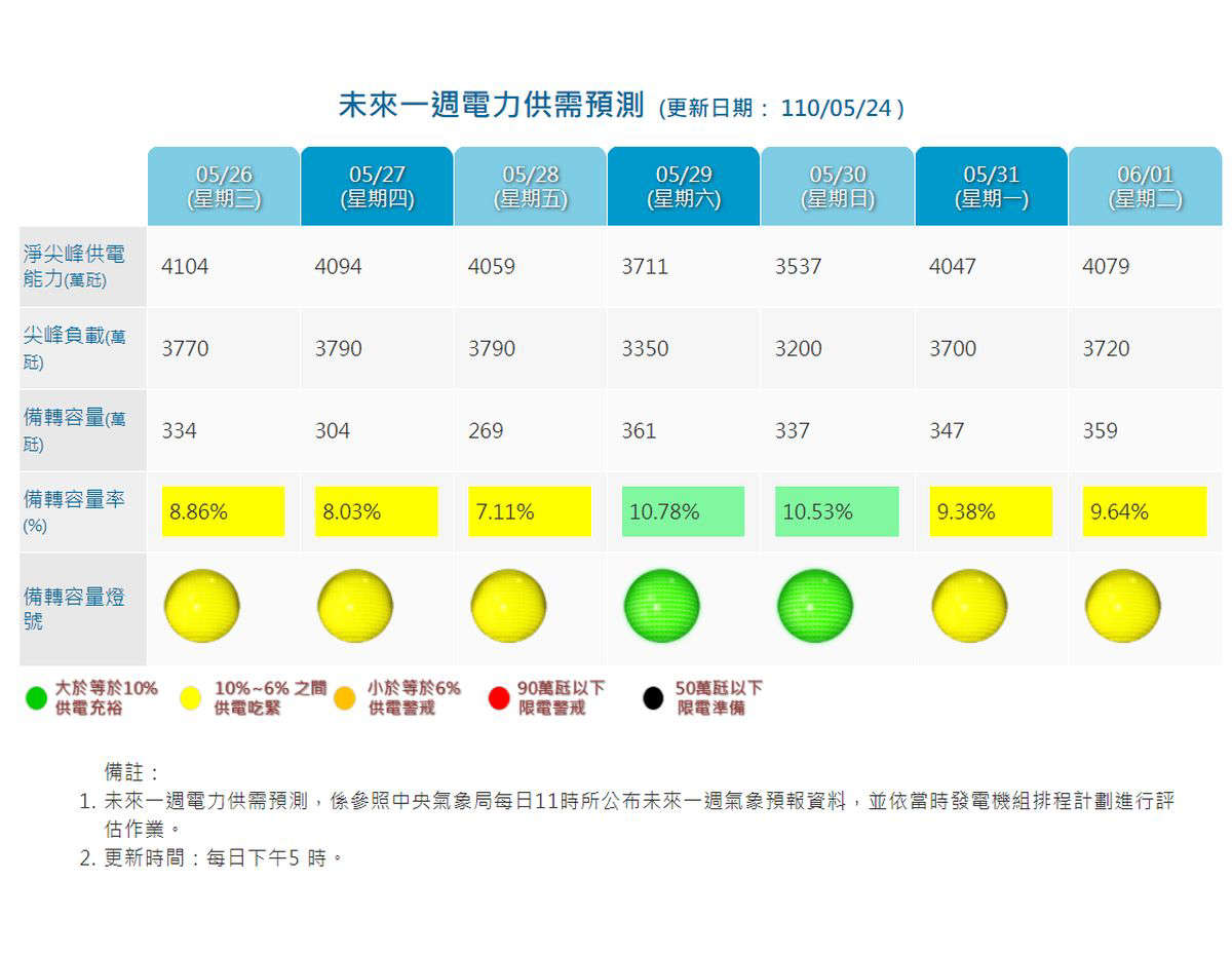 今天氣象預告仍舊是高溫炎熱,再加上學校停課,民生用電增加,預計尖峰用電提高為3740萬瓩。台電的資料顯示,今天供電備轉容量率為8.06%,最大供電量是4041.3萬瓩。台電將透過需量反應等措施來減少工業用電需求,同時呼籲民眾一起節約用電。