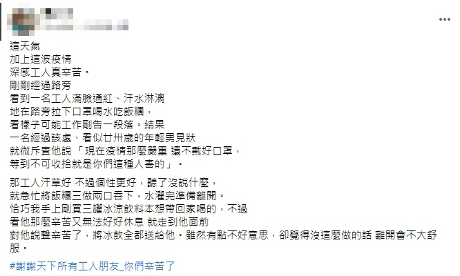 原po看到一名工人滿臉通紅、大汗淋灕,在路邊拉下口罩休息吃飯糰。沒想到一名路過的年輕男性看到後,竟吐槽說:「現在疫情那麼嚴重,還不戴好口罩,等到不可收拾的時候,就是你們這種人害的。」工人沒有反駁,只能急忙將飯糰分成2、3口囫圇吞下,灌了一大口水,然後準備離開。