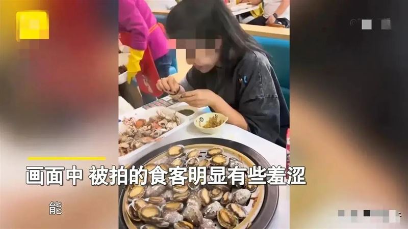 ▼女顧客聽到後,低著頭微笑回應:「能,我喜歡吃鮑魚。」她抬頭看到老闆拿著手機錄影,覺得有點尷尬,連忙將頭轉過去。老闆卻沒有走開,而是繼續錄影,並說:「就愛吃鮑魚,別的都不愛吃。」女顧客沒再說什麼,只是低頭默默用餐。