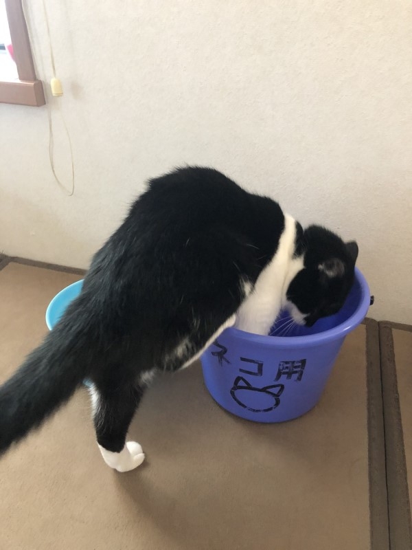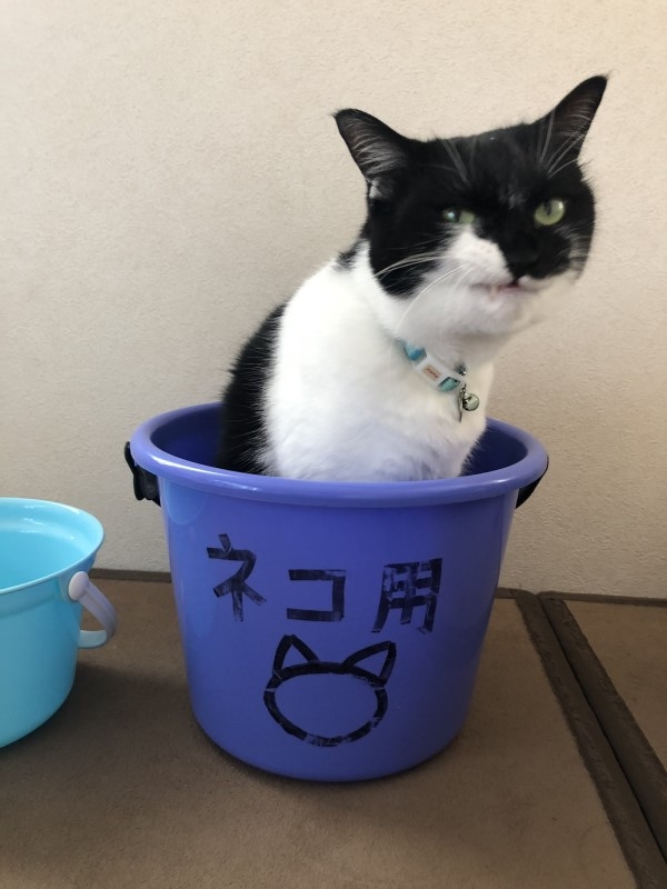 ▼推主拿來一個藍色塑膠桶,在上面寫上「貓專用」三個字,然後放到客廳裡不去管它。FuFu果然對水桶充滿好奇,剛開始只是走近觀察、試探,後來直接跳到水桶裡去,整隻貓咪塞好塞滿。水桶中的空間對FuFu來說剛剛好,牠一窩進去就不想出來了。