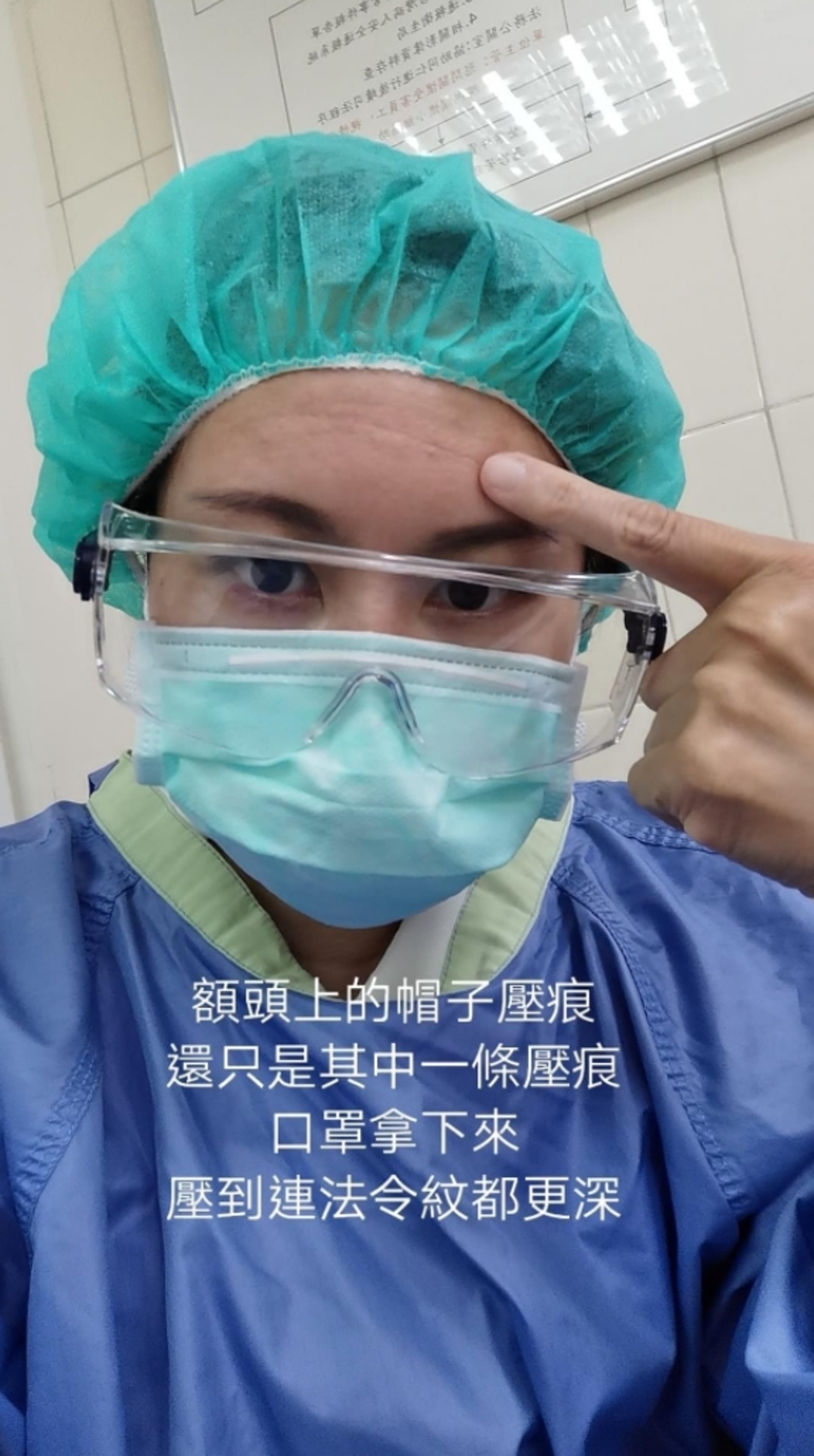 ▼她po出自己穿著防護衣、戴著口罩的照片,「額頭上的帽子壓痕,還只是其中一條壓痕,口罩拿下來,壓到連法令紋都很深」、「一天只有一個N95口罩,怕用髒所以戴外科口罩保護,誰明白這樣呼吸有多困難」。她還呼籲民眾乖乖待在家中,外出戴好口罩,「請用行動宅在家支撐第一線醫護」。