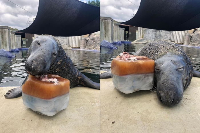 ▼Yulelogs是非常長壽的海豹,為了給牠慶生,管理員送給他一塊魚魚蛋糕,冰塊裡面藏滿了牠最愛吃的魚。收到禮物的Yulelogs開心地瞇起眼睛、露出笑容,看起來萌萌的。