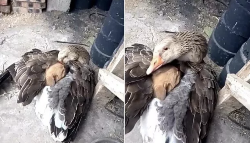 ▼1.這隻鵝將一隻流浪小奶狗護在翅膀下,為牠保暖。