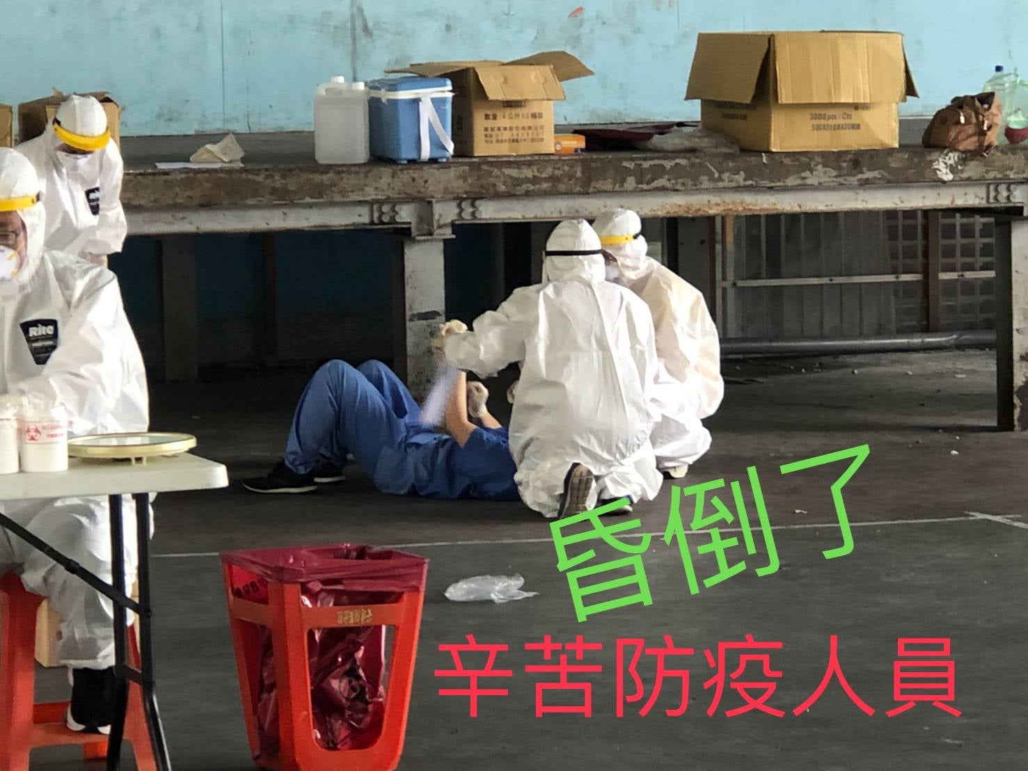 ▼其中一名女護理師疑似因天氣太熱,又全副武裝,工作時竟昏倒在地。她躺在地上休息了40分鐘左右,又起來繼續替民眾服務。當天該篩檢站前來採檢的民眾約有480人。