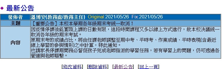 南湖國小校長汪明芳表示,孩子們線上學習的成效可能沒那麼好。就算如期復課,期末考也要經過老師命題、審查的流程,時間緊迫,所以決定要朝取消方向進行。如果復課後老師認為仍需要紙筆測驗,可以小考的形式進行,但校方會提醒紙筆測驗,成績配比不可佔太高。學校還呼籲家長,停課期間務必督促孩子完成老師指派的學習任務,如果有學習上的問題,可以透過各個管道與老師聯繫~