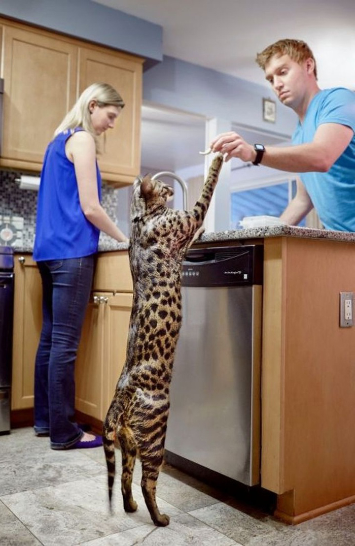 ▼熱帶草原貓(Savannah Cat):這種貓咪是非洲藪貓與家貓結合的品種。牠們智商很高,肌肉發達、線條流暢、野性十足。牠們非常親人,因為繁殖困難,所以身價不菲,深受外國皇室喜愛。成年熱帶草原貓能長到9公斤以上,壽命長約17到20年。