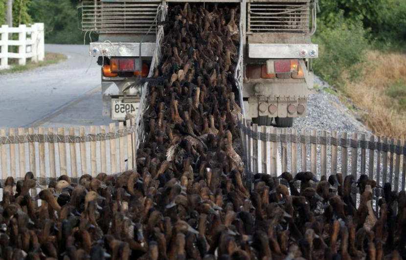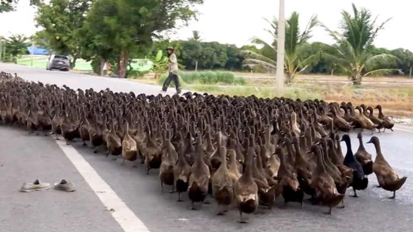 2021年06月02日鴨鴨竟然有這樣的用處~泰國佛統府(Nakhon Pathom)的一處稻田,在收割後放入1萬隻鴨鴨衝進去,幫忙吃掉田裡的害蟲,順便整平田地。無人機從空中拍到這壯觀的畫面,讓人聯想到非洲草原上的動物大遷徙,沒想到鴨鴨們這麼有氣勢~