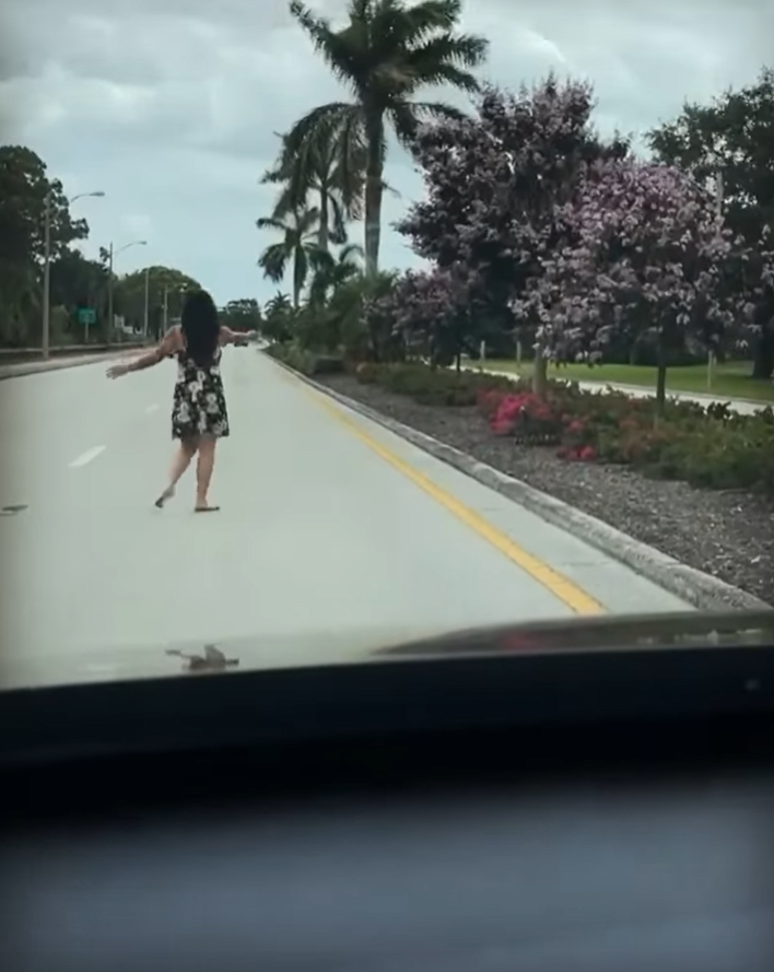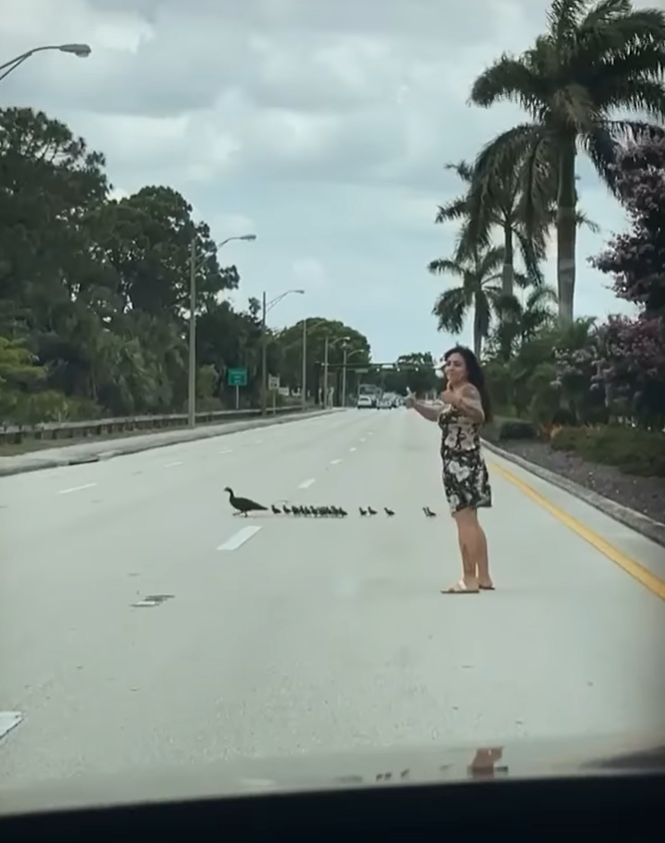 ▼分隔島上有一隻鴨媽媽,牠正帶著一群小鴨準備過馬路,但馬路上車來車往,牠們實在找不到機會過去。這名叫Jessica Unda的女孩發現後決定伸出援手。她不顧自己安危站到馬路中央,攔下來往的車輛,幫助鴨鴨們過馬路。