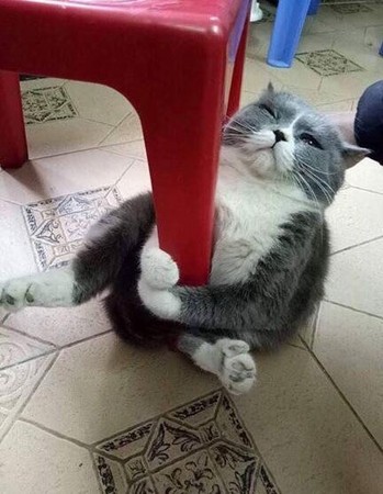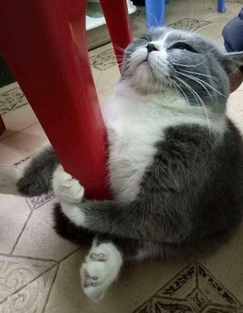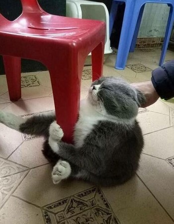 ▼這隻灰白貓胖乎乎的,用前爪緊緊抱住塑膠椅的椅腳。牠緊閉雙眼,哪怕主人伸手抓牠也不理不睬,似乎不睜眼就什麼都不會發生。