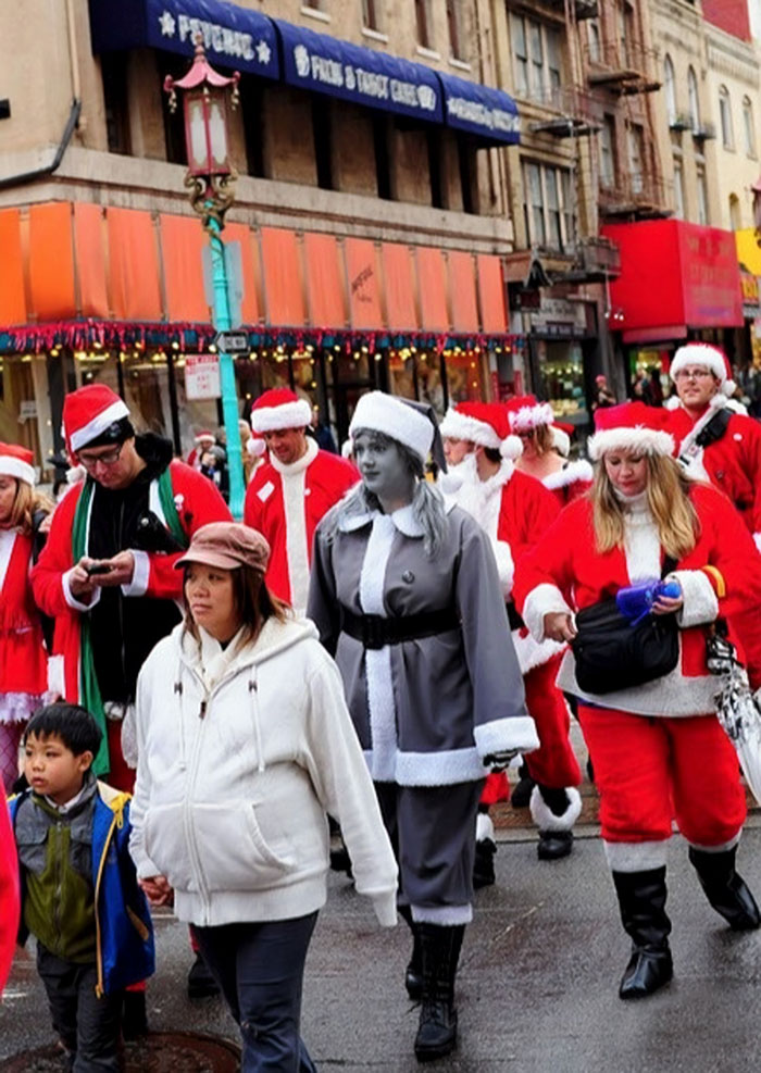 ▼她穿了一件黑白的聖誕老人服裝。