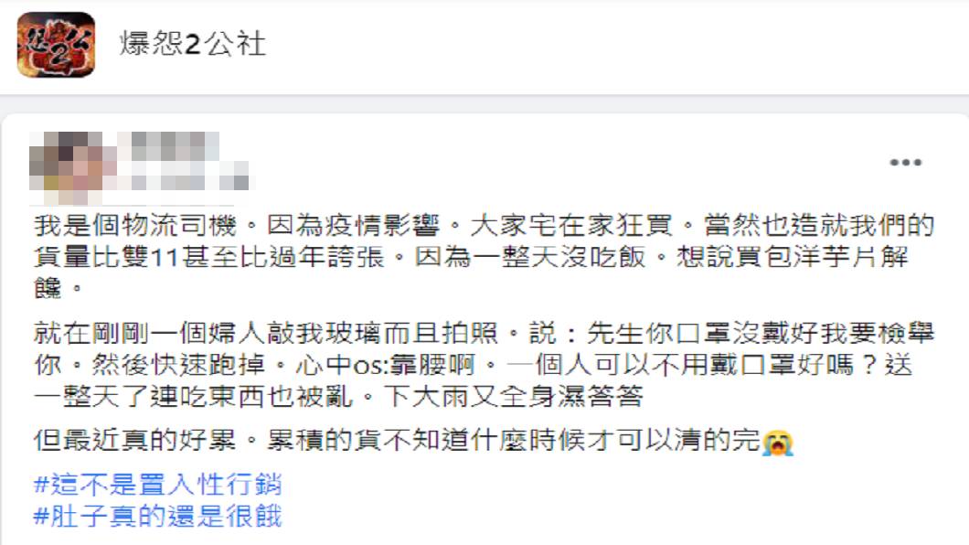 2021年06月03日本土疫情嚴峻,全台升至三級警戒。很多民眾為了減少外出改由網路購物,導致物流業貨運量暴增。日前一名物流車司機在臉書社團「爆怨2公社」發文說,因為忙著送貨沒時間吃飯,只能趁工作空檔獨自在車上吃洋芋片充飢。沒想到一名婦人過來敲窗拍照,還說要檢舉他「口罩沒戴好」,這讓他非常無奈。