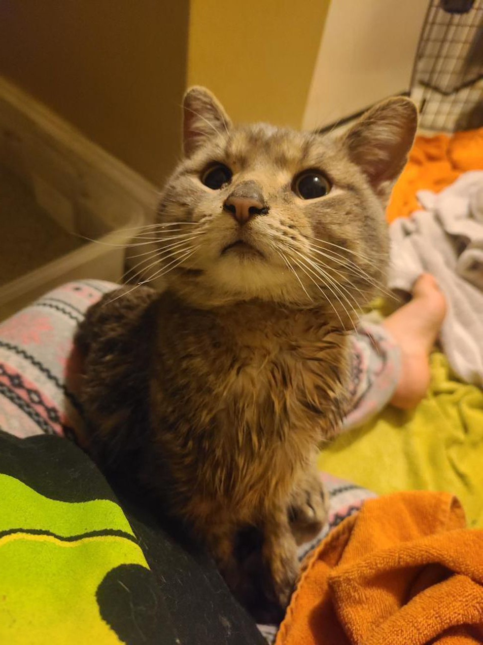 2021年06月04日大約一個月前,國外網友Kay遇到了一隻浪貓。確切的說,那隻貓咪是自己找上門的。那是一個寒冷的雨夜,貓咪在Kay的辦公室門口喵喵叫著,似乎是在求助。Kay的心都要融化了,她跟室友Lauren Keim商量後,決定將牠帶回家~