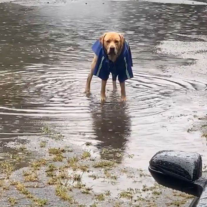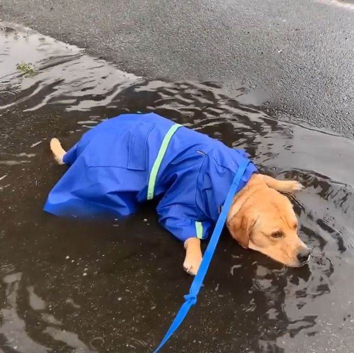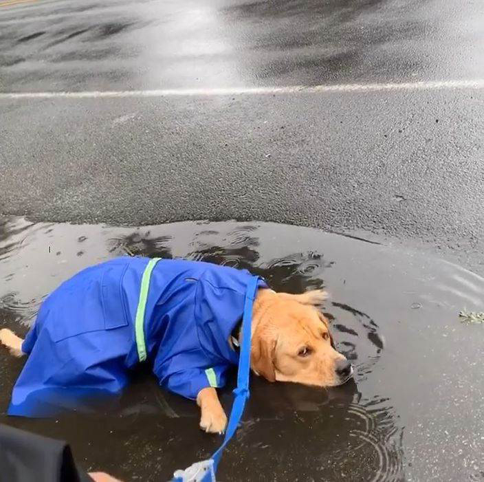 雨天散步!主人給狗狗套上雨衣 牠見水坑「秒趴成海龜」:反正都穿雨衣惹啊~