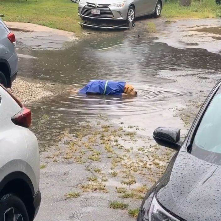 2021年06月07日炎熱的夏天,玩水是最棒的消暑活動~拉布拉多犬大多很愛玩水,而且很擅長游泳。國外一位飼主養了一隻拉布拉多犬Peanutbutter James(PJ),那天主人帶牠外出散步時,特別給牠穿上雨衣,沒想到PJ直接把雨衣當成了泳衣,趴到水坑裡玩了起來。