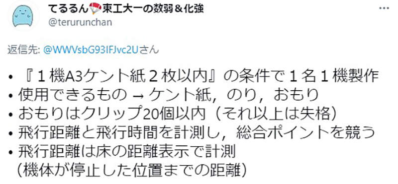 ▼網友們看到這件事,都質疑比賽規則是不是有問題。推主特別貼出參賽規則,指出規則當中只有規定材料,並沒有針對飛機的外型設限:「每人以2張A3制圖紙以內的材料製作1架。只能用制圖紙、膠水、重物。重物限定迴紋針20個以內。(超過就失去資格)測量飛行距離和飛行時間,計算綜合得分。飛行距離以地板上的標示距離為準。(到機體停止的距離)」