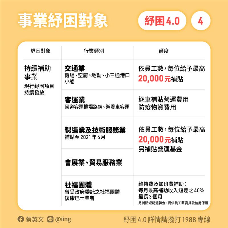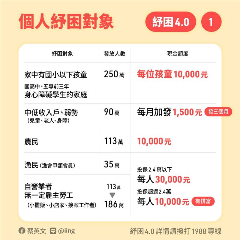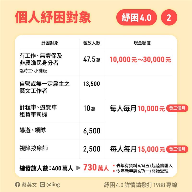 ▼原po還貼出一張「紓困4.0一圖秒懂」圖片,表示自己屬於「無一定雇主及自營工作者」的這一欄,「要領到我這個三萬的話,白話一點就是,沒有給人僱用,並且有自行投保工會三個月以上,保額要在最低額度24000$,高於的話只能領一萬」。