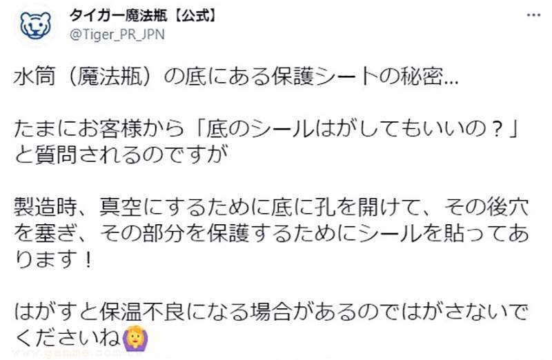 ▼日本知名家電廠商虎牌(Tiger)表示:「分享一個關於保溫瓶底部貼紙的祕密……我們偶爾會接到客人詢問『底部的貼紙可以撕掉嗎?』的問題。製造保溫瓶的時候,為了抽真空會先在底部開孔,之後再將孔封起來。貼紙正是為了保護那個部位!如果撕掉有可能會造成保溫效果不良,請大家不要撕掉喔。」