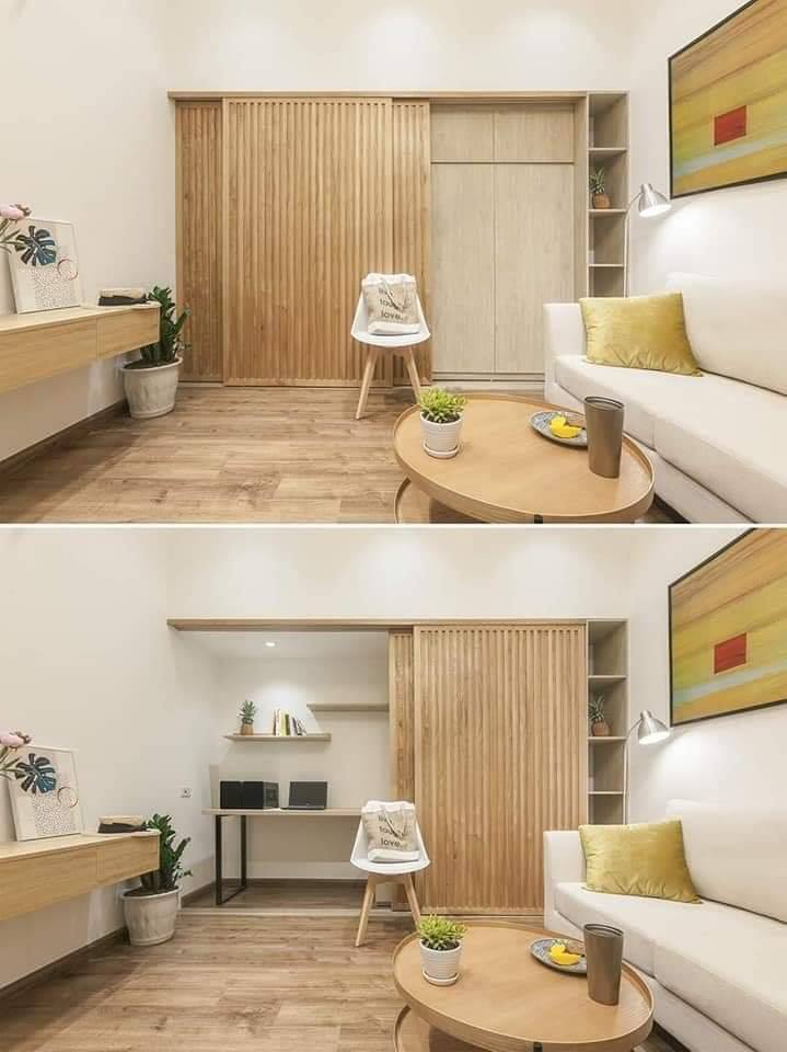 ▼設計師還在客廳配置了一道滑門,將整個工作室與衣櫃藏在裡面,原本有限的空間分隔出不同的功能,讓整個空間維持整潔有序的感覺。
