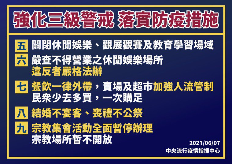 ▼蘇貞昌表示,因應三級管制,請教育部做好大學指考的相關防疫規劃,包括試務人員的疫苗接種、試場的分流等政策,也要配合指揮中心並妥為對外說明。這波疫情爆發以來,雙北從5月15日升至三級警戒,全台也在5月19日升級,並於5月25日宣布延長警戒至6月14日,但現在疫情並未趨緩。行政院宣布三級警戒延至6月28日,各級學校停課到暑假,並公布12項防疫措施強化落實: