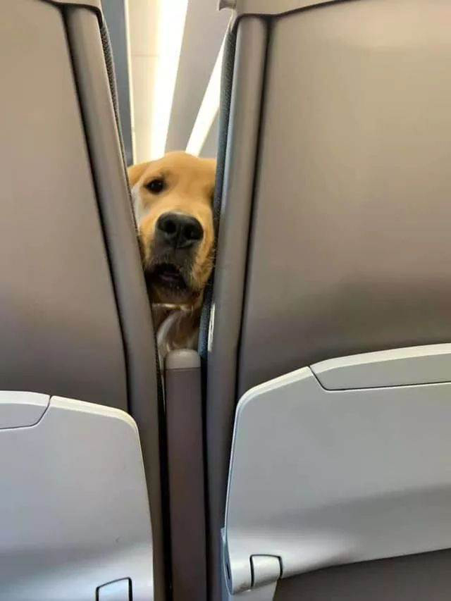 ▼Huxley趁主人不注意,悄悄溜到前排的座位上。牠睜著水汪汪的大眼睛看向陌生的乘客,似乎在說:「我可以坐到你旁邊嗎?馬麻不理我,你陪我玩吧!」前排乘客非常驚喜,他開心地讓Huxley坐下,享受有狗狗陪伴的飛行時光。