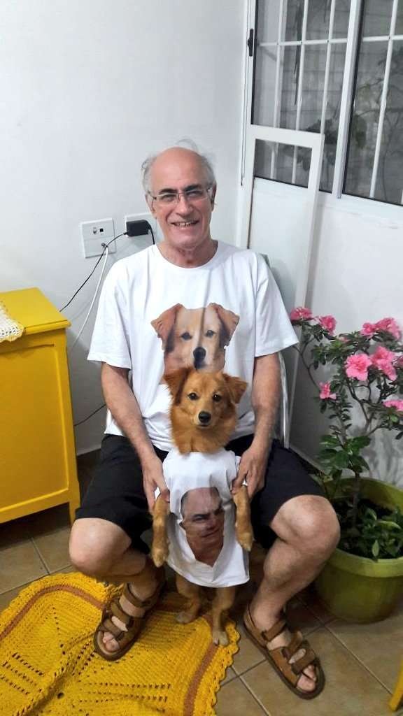 ▼3個月後,爸爸反而成為了家裡最愛Pitoco的人。他還特別訂做兩件衣服,一件上面印著Pitoco的頭像,是爸爸要穿的;另一件上印著爸爸自己的照片,讓Pitoco穿在身上。這兩件父子裝很有愛,Vicinius卻忍不住吃醋:「我連一件父子裝都沒有耶!」