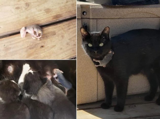 ▼4.貓咪媽媽把孤兒負鼠寶寶當成自己的小孩照顧。負鼠寶寶每天掛在牠身上,把牠當成媽媽。