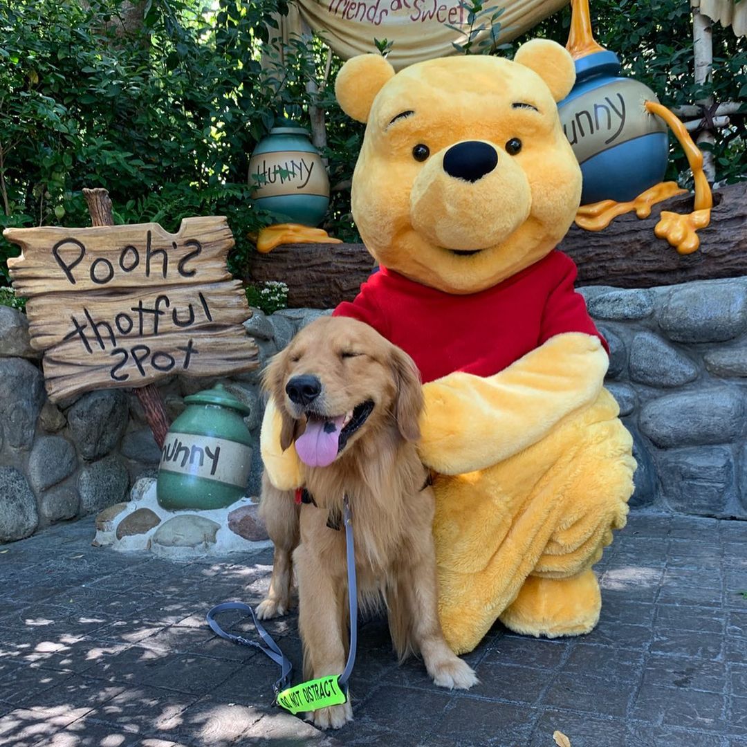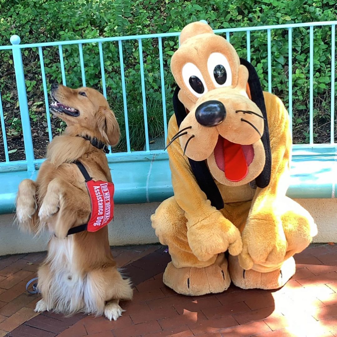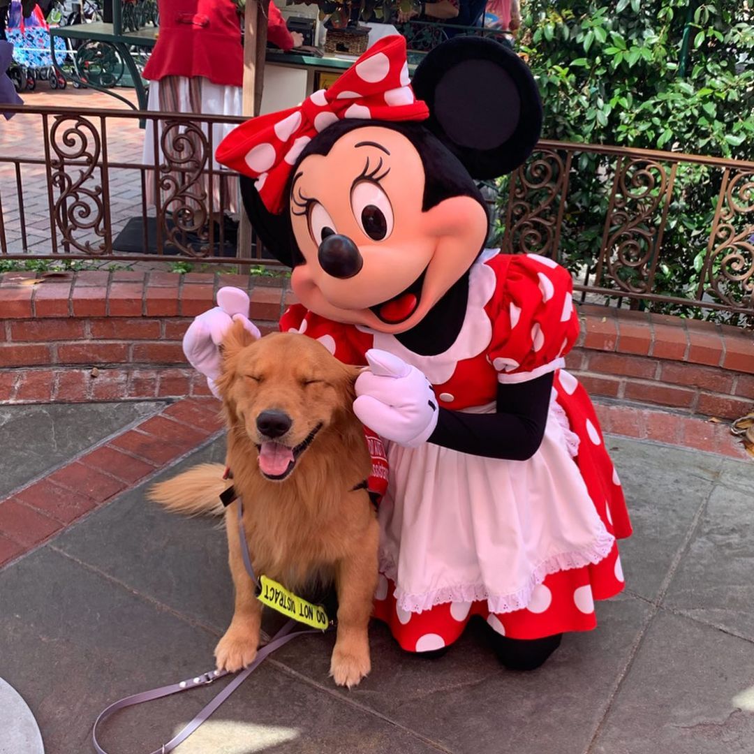▼服務犬需要經過嚴格的訓練,為了讓Henry適應高壓工作環境,Jessica經常帶牠去迪士尼樂園。Henry非常喜歡那裡,牠頭戴小髮箍、跟各種卡通人物合照,臉上的笑容非常燦爛。