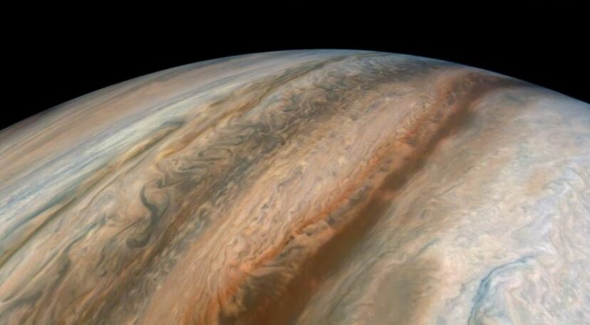 ▼木星頂部雲層有明顯的條紋,條帶明暗相間、顏色斑斕。木星快速自傳,雲被拉成長條形,淺色的條帶就是大氣的高氣壓帶;深色的條帶則是低氣壓帶。NASA經常公布JunoCam相機拍攝的照片,並歡迎網友們後製處理。