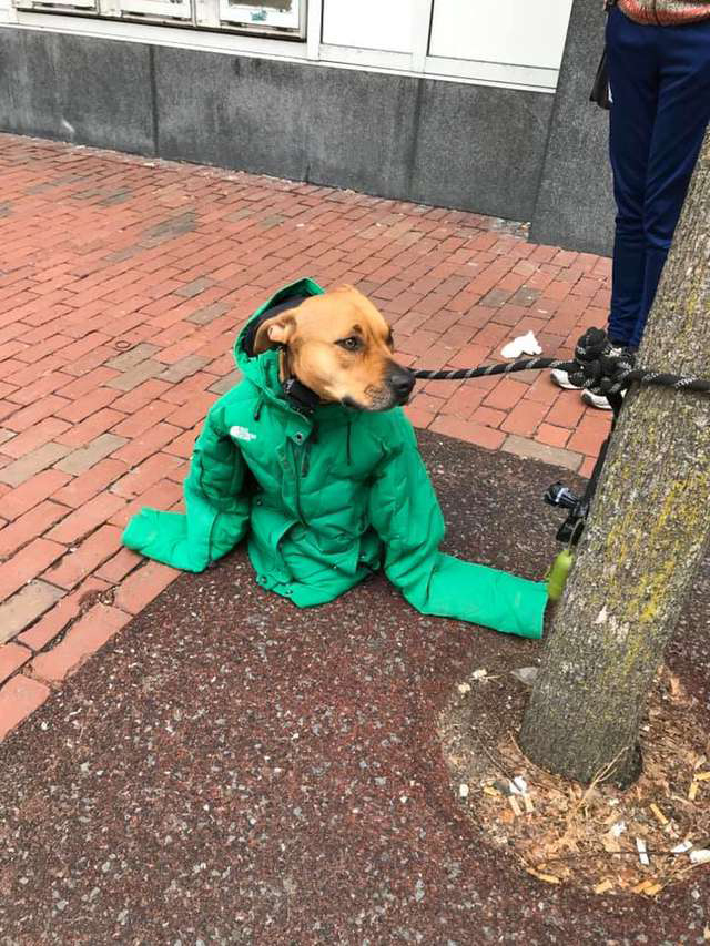 ▼主人將外套圍在狗狗身上時,狗狗坐在那裡一動不動,開心地穿上溫暖的外套。如果郵局允許狗狗進入,她一定會把狗狗帶進去,但她不能這樣做。雖然她去郵局可能只要花幾分鐘就能把事情處理完,但她還是給狗狗穿上外套,確保在她回來之前,狗狗能夠儘量舒適。