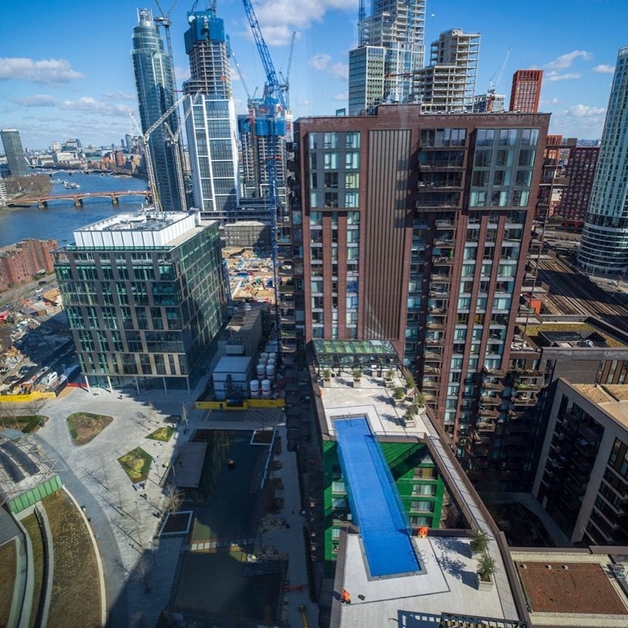 ▼2013年倫敦九榆樹區(Nine Elms)豪宅社區「Embassy Gardens」落成時,社區內就有屋頂餐廳、私人酒吧影院、溫室花園和24小時開放的室內泳池等設施。但這裡沒有戶外泳池,讓開發商EcoWorld Ballymore覺得非常遺憾。團隊決定另闢蹊徑,在空中建造一座泳池。